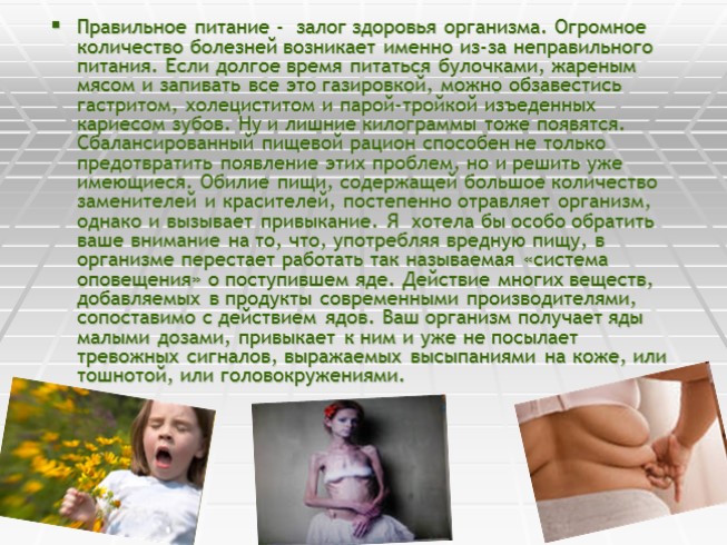 Правильное питание - залог здоровья организма. Огромное количество болезней возникает именно из-за неправильного питания. Если долгое время питаться булочками, жареным мясом и запивать все это газировкой, можно обзавестись гастритом, холециститом и парой-тройкой изъеденных кариесом зубов. Ну и лишние килограммы тоже появятся. Сбалансированный пищевой рацион способен не только предотвратить появление этих проблем, но и решить уже имеющиеся. Обилие пищи, содержащей большое количество заменителей и красителей, постепенно отравляет организм, однако и вызывает привыкание. Я хотела бы особо обратить ваше внимание на то, что, употребляя вредную пищу, в организме перестает работать так называемая «система оповещения» о поступившем яде. Действие многих веществ, добавляемых в продукты современными производителями, сопоставимо с действием ядов. Ваш организм получает яды малыми дозами, привыкает к ним и уже не посылает тревожных сигналов, выражаемых высыпаниями на коже, или тошнотой, или головокружениями.