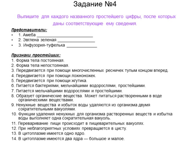 Задание №4 Выпишите для каждого названного простейшего цифры, после которых даны соответствующие ему сведения.
