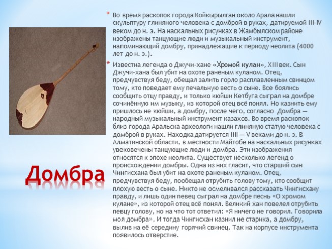 Известна легенда о Джучи-хане «Хромой кулан», XIII век. Сын Джучи-хана был убит на охоте раненым куланом. Отец, предчувствуя беду, обещал залить горло расплавленным свинцом тому, кто поведает ему печальную весть о сыне. Все боялись сообщить отцу правду, и только кюйши Кетбуга сыграл на домбре сочинённую им музыку, из которой отец всё понял. Но казнить ему пришлось не кюйши, а домбру, после чего, согласно Домбра — народный музыкальный инструмент казахов. Во время раскопок близ города Аральска археологи нашли глиняную статую человека с домброй в руках. Находка датируется IIII — V веками до н. э. В Алматинской области, в местности Майтобе на наскальных рисунках увековечены танцующие люди и домбра. Эти изображения относятся к эпохе неолита. Существует несколько легенд о происхождении домбры. Одна из них гласит, что старший сын Чингисхана был убит на охоте раненым куланом. Отец, предчувствуя беду, пообещал отрубить голову тому, кто сообщит плохую весть о сыне. Никто не осмеливался рассказать Чингисхану правду, и лишь один певец сыграл на домбре песнь «О хромом кулане», из которой отец всё понял. Великий хан повелел отрубить певцу голову, но на что тот ответил: «Я ничего не говорил. Говорила моя домбра». И тогда Чингисхан казнил не старика, а домбру, вылив на её середину горячий свинец. Так на корпусе инструмента появилось отверстие.
