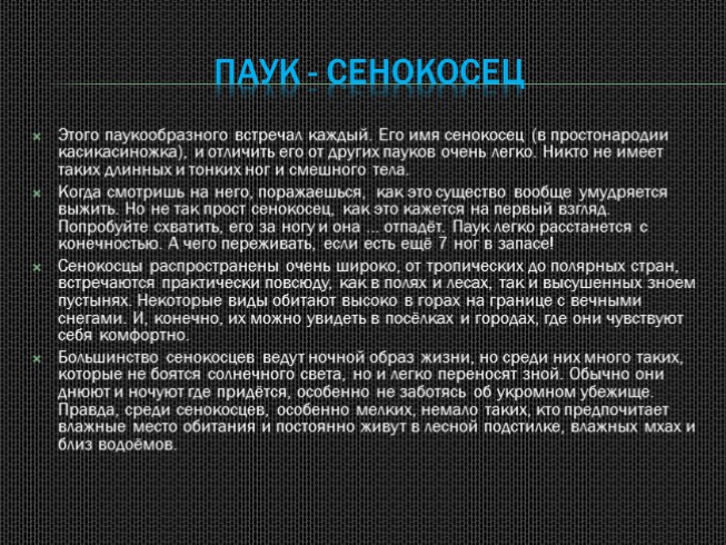 Этого паукообразного встречал каждый. Его имя сенокосец (в простонародии касикасиножка), и отличить его от других пауков очень легко. Никто не имеет таких длинных и тонких ног и смешного тела.