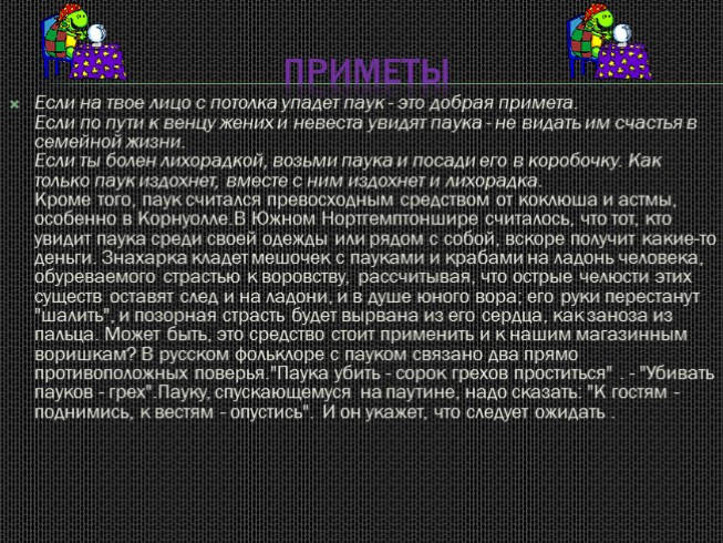 Если на твое лицо с потолка упадет паук - это добрая примета. Если по пути к венцу жених и невеста увидят паука - не видать им счастья в семейной жизни. Если ты болен лихорадкой, возьми паука и посади его в коробочку. Как только паук издохнет, вместе с ним издохнет и лихорадка. Кроме того, паук считался превосходным средством от коклюша и астмы, особенно в Корнуолле.В Южном Нортгемптоншире считалось, что тот, кто увидит паука среди своей одежды или рядом с собой, вскоре получит какие-то деньги. Знахарка кладет мешочек с пауками и крабами на ладонь человека, обуреваемого страстью к воровству, рассчитывая, что острые челюсти этих существ оставят след и на ладони, и в душе юного вора; его руки перестанут "шалить", и позорная страсть будет вырвана из его сердца, как заноза из пальца. Может быть, это средство стоит применить и к нашим магазинным воришкам? В русском фольклоре с пауком связано два прямо противоположных поверья."Паука убить - сорок грехов проститься" . - "Убивать пауков - грех".Пауку, спускающемуся на паутине, надо сказать: "К гостям - поднимись, к вестям - опустись". И он укажет, что следует ожидать .