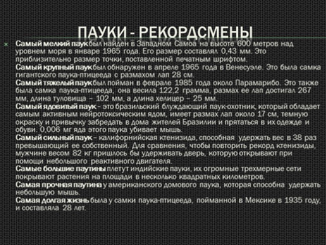 Самый мелкий паук был найден в Западном Самоа на высоте 600 метров над уровнем моря в январе 1965 года. Его размер составлял 0,43 мм. Это приблизительно размер точки, поставленной печатным шрифтом. Самый крупный паук был обнаружен в апреле 1965 года в Венесуэле. Это была самка гигантского паука-птицееда с размахом лап 28 см. Самый тяжелый паук был пойман в феврале 1985 года около Парамарибо. Это также была самка паука-птицееда, она весила 122,2 грамма, размах ее лап достигал 267 мм, длина туловища – 102 мм, а длина хелицер – 25 мм. Самый ядовитый паук – это бразильский блуждающий паук-охотник, который обладает самым активным нейротоксическим ядом, имеет размах лап около 17 см, темную окраску и привычку забредать в дома жителей Бразилии и прятаться в их одежде и обуви. 0,006 мг яда этого паука убивает мышь. Самый сильный паук – калифорнийская ктенизида, способная удержать вес в 38 раз превышающий ее собственный. Для сравнения, чтобы повторить рекорд ктенизиды, мужчине весом 82 кг пришлось бы удерживать дверь, которую открывают при помощи небольшого реактивного двигателя. Самые большие паутины плетут индийские пауки, их огромные трехмерные сети покрывают растения на площади в несколько квадратных километров. Самая прочная паутина у американского домового паука, которая способна удержать небольшую мышь. Самая долгая жизнь была у самки паука-птицееда, пойманной в Мексике в 1935 году, и составляла 28 лет.