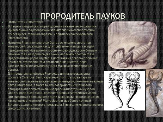 В лагунах силурийских морей достигли значительного развития удивительные паукообразные членистоногие (Arachnomorpha), относящиеся, главным образом, к подклассу ракоскорпионов (Merostomata).