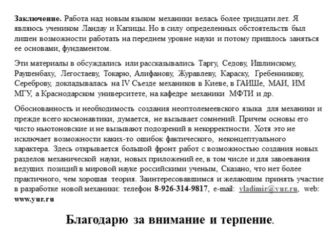 Заключение. Работа над новым языком механики велась более тридцати лет. Я являюсь учеником Ландау и Капицы. Но в силу определенных обстоятельств был лишен возможности работать на переднем уровне науки и потому пришлось заняться ее основами, фундаментом.