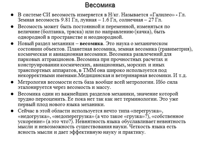 Весомика один из важнейших разделов механики, значение которой трудно переоценить. Ее пока нет так как нет терминологии. Это уже первый плод нового языка механики.