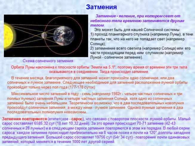 Затмения повторяются (египетское - сарос), что связано с поворотом плоскости лунной орбиты. Малый сарос составляет 6585,32 сут (18 лет 10,32 дней). За это время происходит 70-71 затмение (42-43 солнечных и 28 лунных) и в следующем саросе затмения повторяются в этом же порядке. В любой серии сароса каждое затмение происходит приблизительно на 8 часов позже и почти на 120° долготы западнее предыдущего затмения. Большой сарос составляет 19756 сут (54г 34 сут) - повторение почти одинаковых затмений, который меняется в течение 1000 лет другой серией.