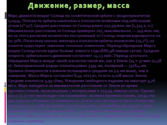 Марс почти вдвое меньше Земли по размерам — его экваториальный радиус равен 3396,9 км (53 % земного). Площадь поверхности Марса примерно равна площади суши на Земле. Полярный радиус Марса примерно на 21 км меньше экваториального. Масса планеты — 6,418×1023 кг (11 % массы Земли). Ускорение свободного падения на экваторе равно 3,693 м/сек² (0,378 земного); первая космическая скорость составляет 3,6 км/сек и вторая — 5,027 км/сек. Марс вращается вокруг своей оси, наклонённой к плоскости орбиты под углом 24°56′ с периодом 24 часа 37 минут 22,7 секунд. Марсианский год состоит из 668,6 марсианских солнечных суток (называемых солами). Наклон оси вращения Марса обеспечивает смену времён года. При этом вытянутость орбиты приводит к большим различиям их продолжительности. Так, северная весна и лето, вместе взятые, длятся 371 сол, т. е. заметно больше половины марсианского года. В то же время они приходятся на участок орбиты Марса, удалённый от Солнца. Поэтому на Марсе северное лето долгое и прохладное, а южное — короткое и жаркое.