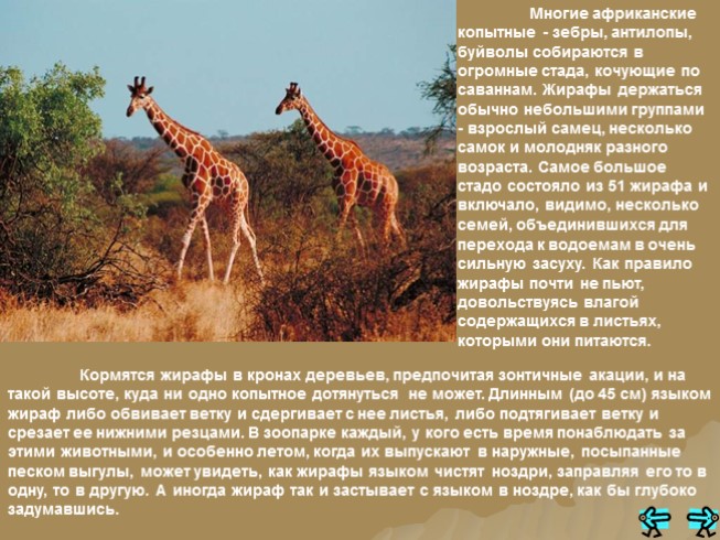 Многие африканские копытные - зебры, антилопы, буйволы собираются в огромные стада, кочующие по саваннам. Жирафы держаться обычно небольшими группами - взрослый самец, несколько самок и молодняк разного возраста. Самое большое стадо состояло из 51 жирафа и включало, видимо, несколько семей, объединившихся для перехода к водоемам в очень сильную засуху. Как правило жирафы почти не пьют, довольствуясь влагой содержащихся в листьях, которыми они питаются.
