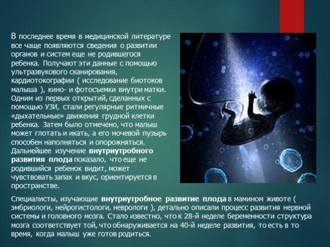 В последнее время в медицинской литературе все чаще появляются сведения о развитии органов и систем еще не родившегося ребенка. Получают эти данные с помощью ультразвукового сканирования, кардиотокографии ( исследование биотоков малыша ), кино- и фотосъемки внутри матки. Одним из первых открытий, сделанных с помощью УЗИ, стали регулярные ритмичные «дыхательные» движения грудной клетки ребенка. Затем было отмечено, что малыш может глотать и икать, а его мочевой пузырь способен наполняться и опорожняться. Дальнейшее изучение внутриутробного развития плода показало, что еще не родившийся ребенок видит, может чувствовать запах и вкус, ориентируется в пространстве.