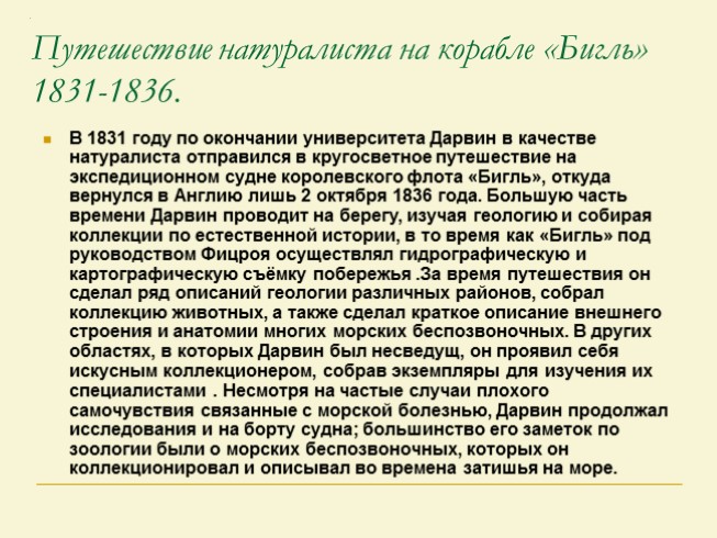 В 1831 году по окончании университета Дарвин в качестве натуралиста отправился в кругосветное путешествие на экспедиционном судне королевского флота «Бигль», откуда вернулся в Англию лишь 2 октября 1836 года. Большую часть времени Дарвин проводит на берегу, изучая геологию и собирая коллекции по естественной истории, в то время как «Бигль» под руководством Фицроя осуществлял гидрографическую и картографическую съёмку побережья .За время путешествия он сделал ряд описаний геологии различных районов, собрал коллекцию животных, а также сделал краткое описание внешнего строения и анатомии многих морских беспозвоночных. В других областях, в которых Дарвин был несведущ, он проявил себя искусным коллекционером, собрав экземпляры для изучения их специалистами . Несмотря на частые случаи плохого самочувствия связанные с морской болезнью, Дарвин продолжал исследования и на борту судна; большинство его заметок по зоологии были о морских беспозвоночных, которых он коллекционировал и описывал во времена затишья на море.
