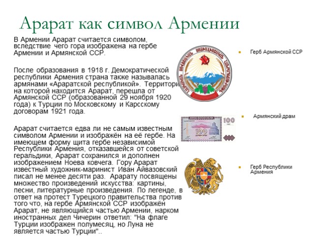 Согласно библейским сказаниям, именно Арарат стал причалом Ноева ковчега. Потом Ной отпустил голубя и голубь принес оливковую ветвь, что означало: вода ушла. Тогда Ной со своей семьей спустился с горы и жил в Араратской долине. Посадил виноград и положил начало виноделию. Для каждого армянина Арарат является символом Родины, Родины которую мы потеряли. Как писал Э.С. Айрапетян: «От великой Армении сегодня осталась только голова. В этом легко убедиться, посмотрев на карту».