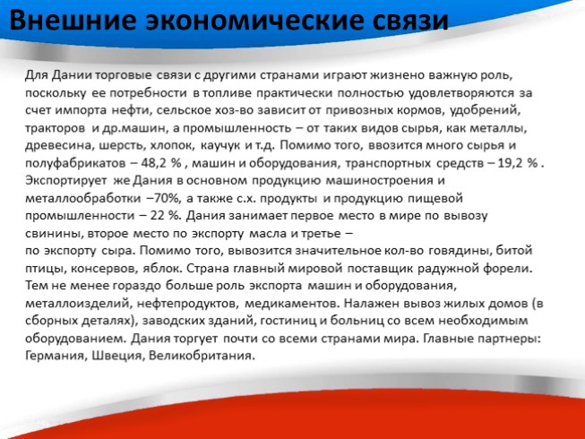 Для Дании торговые связи с другими странами играют жизнено важную роль, поскольку ее потребности в топливе практически полностью удовлетворяются за счет импорта нефти, сельское хоз-во зависит от привозных кормов, удобрений, тракторов и др.машин, а промышленность – от таких видов сырья, как металлы, древесина, шерсть, хлопок, каучук и т.д. Помимо того, ввозится много сырья и полуфабрикатов – 48,2 % , машин и оборудования, транспортных средств – 19,2 % . Экспортирует же Дания в основном продукцию машиностроения и металлообработки –70%, а также с.х. продукты и продукцию пищевой промышленности – 22 %. Дания занимает первое место в мире по вывозу свинины, второе место по экспорту масла и третье –