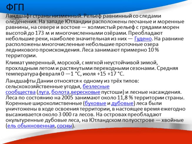 Ландшафт страны низменный. Рельеф равнинный со следами оледенения. На западе Ютландии расположены песчаные и моренные равнины, на севере и востоке — холмистый рельеф с грядами морен высотой до 173 м и многочисленными озёрами. Преобладают небольшие реки, наиболее значительная из них — Гудено. На равнине расположены многочисленные небольшие проточные озера ледникового происхождения. Леса занимают примерно 10 % территории.