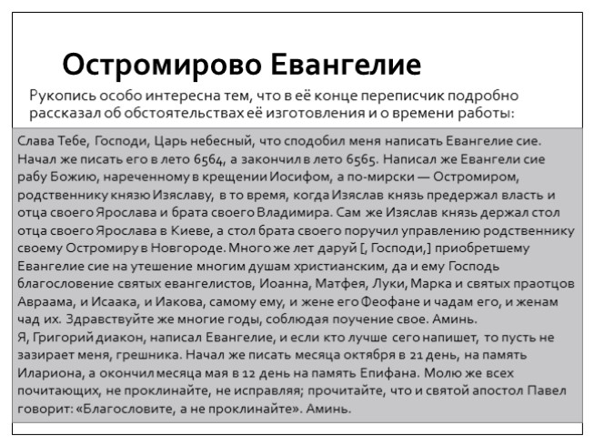 Слава Тебе, Господи, Царь небесный, что сподобил меня написать Евангелие сие. Начал же писать его в лето 6564, а закончил в лето 6565. Написал же Евангели сие рабу Божию, нареченному в крещении Иосифом, а по-мирски — Остромиром, родственнику князю Изяславу, в то время, когда Изяслав князь предержал власть и отца своего Ярослава и брата своего Владимира. Сам же Изяслав князь держал стол отца своего Ярослава в Киеве, а стол брата своего поручил управлению родственнику своему Остромиру в Новгороде. Много же лет даруй [, Господи,] приобретшему Евангелие сие на утешение многим душам христианским, да и ему Господь благословение святых евангелистов, Иоанна, Матфея, Луки, Марка и святых праотцов Авраама, и Исаака, и Иакова, самому ему, и жене его Феофане и чадам его, и женам чад их. Здравствуйте же многие годы, соблюдая поучение свое. Аминь.