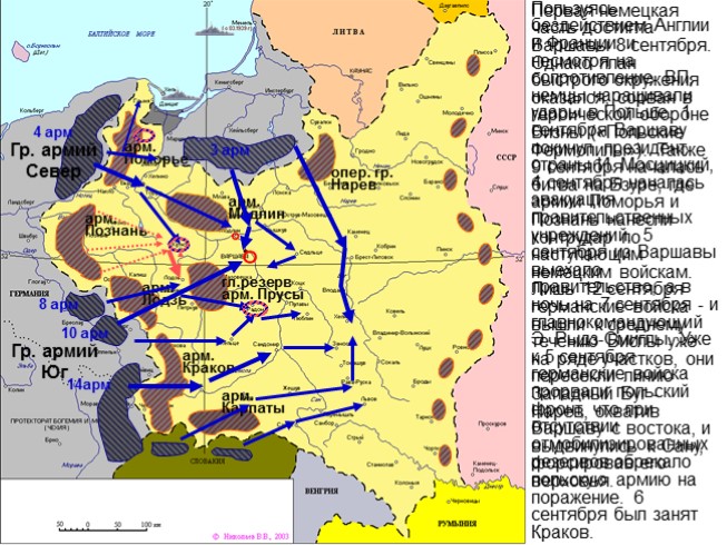 Пользуясь бездействием Англии и Франции и несмотря на сопротивление ВП, немцы наращивали удары в Польше. 1 сентября Варшаву покинул президент страны И. Мосцицкий, 4 сентября началась эвакуация правительственных учреждений. 5 сентября из Варшавы выехало правительство, а в ночь на 7 сентября - и главнокомандующий Э. Рыдз-Смиглы. Уже к 5 сентября германские войска прорвали польский фронт, что при отсутствии отмобилизированных резервов обрекало польскую армию на поражение. 6 сентября был занят Краков.