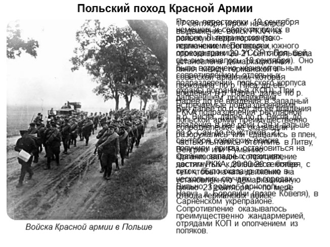 17 сентября утром началось выдвижение войск РККА на польскую территорию (за исключением Полесья и южного отрезка границы УССР с Польшей, где оно началось 18 сентября). Оно было встречено незначительным сопротивлением отдельных подразделений польского корпуса охраны пограничья (КОП). При дальнейшем продвижении встречаемые подразделениями РККА подразделения регулярной польской армии преимущественно сопротивления не оказывали и разоружались или сдавались в плен, частью пытались отступить в Литву, Венгрию или Румынию. Организованное сопротивление частям РККА, длившееся более суток, было оказано только в нескольких случаях: в городах Вильно, Гродно, Тарнополь, д. Навуз, д. Боровичи (возле Ковеля), в Сарненском укрепрайоне. Сопротивление оказывалось преимущественно жандармерией, отрядами КОП и ополчением из поляков.