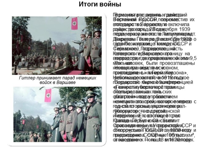 В результате военных действий Германии и СССР польское государство перестало существовать. 28 сентября 1939 года, сразу же после капитуляции Варшавы был подписан Договор о дружбе и границе между СССР и Германией, определивший советско-германскую границу на территории оккупированной ими Польши.