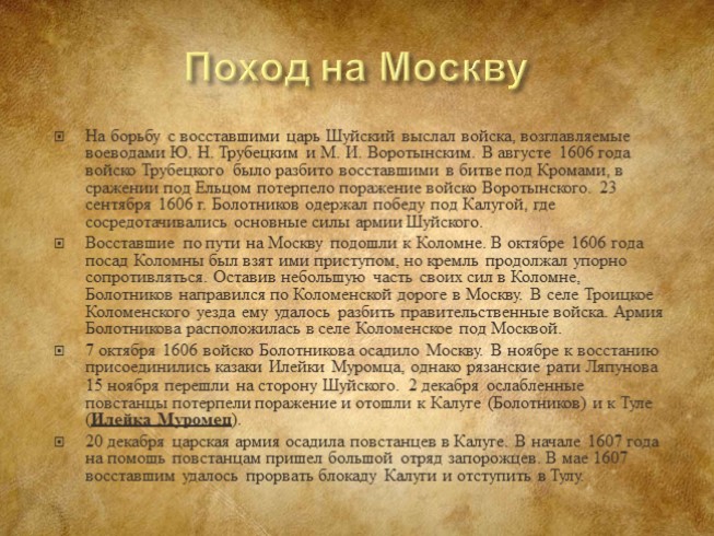 7 октября 1606 войско Болотникова осадило Москву. В ноябре к восстанию присоединились казаки Илейки Муромца, однако рязанские рати Ляпунова 15 ноября перешли на сторону Шуйского. 2 декабря ослабленные повстанцы потерпели поражение и отошли к Калуге (Болотников) и к Туле (Илейка Муромец).