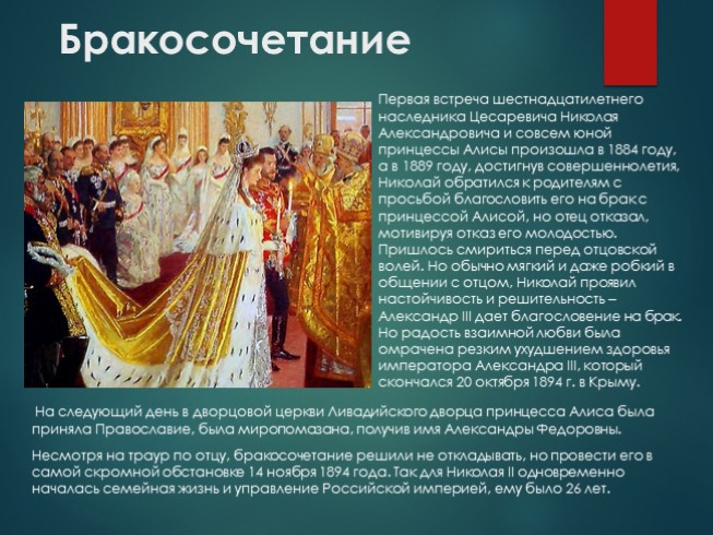 Первая встреча шестнадцатилетнего наследника Цесаревича Николая Александровича и совсем юной принцессы Алисы произошла в 1884 году, а в 1889 году, достигнув совершеннолетия, Николай обратился к родителям с просьбой благословить его на брак с принцессой Алисой, но отец отказал, мотивируя отказ его молодостью. Пришлось смириться перед отцовской волей. Но обычно мягкий и даже робкий в общении с отцом, Николай проявил настойчивость и решительность – Александр III дает благословение на брак. Но радость взаимной любви была омрачена резким ухудшением здоровья императора Александра III, который скончался 20 октября 1894 г. в Крыму.