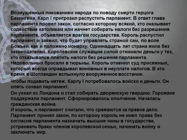 Возмущенный ликованием народа по поводу смерти герцога Бекингема, Карл I пригрозил распустить парламент. В ответ глава парламента провел закон, согласно которому всякий, кто оказывает содействие католикам или начнет собирать налоги без разрешения парламента, объявляется врагом государства. Король распустил парламент и заявил, что будет управлять страной сам, по воле Божьей, как и положено монарху. Одиннадцать лет страна жила без законодателей. Королевские служащие силой отнимали деньги у тех, кто отказывался платить налоги без решения парламента. Недовольных бросали в тюрьмы. Король отменил суд присяжных, который всегда оправдывал виновных в неуплате налогов. В это время в Шотландии вспыхнуло вооруженное восстание.