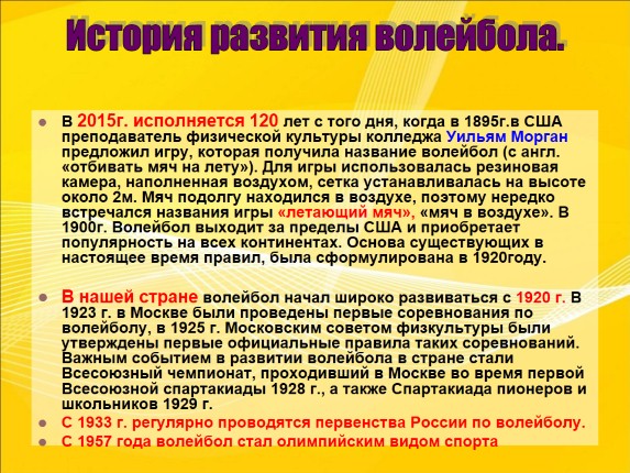 В 2015г. исполняется 120 лет с того дня, когда в 1895г.в США преподаватель физической культуры колледжа Уильям Морган предложил игру, которая получила название волейбол (с англ. «отбивать мяч на лету»). Для игры использовалась резиновая камера, наполненная воздухом, сетка устанавливалась на высоте около 2м. Мяч подолгу находился в воздухе, поэтому нередко встречался названия игры «летающий мяч», «мяч в воздухе». В 1900г. Волейбол выходит за пределы США и приобретает популярность на всех континентах. Основа существующих в настоящее время правил, была сформулирована в 1920году.