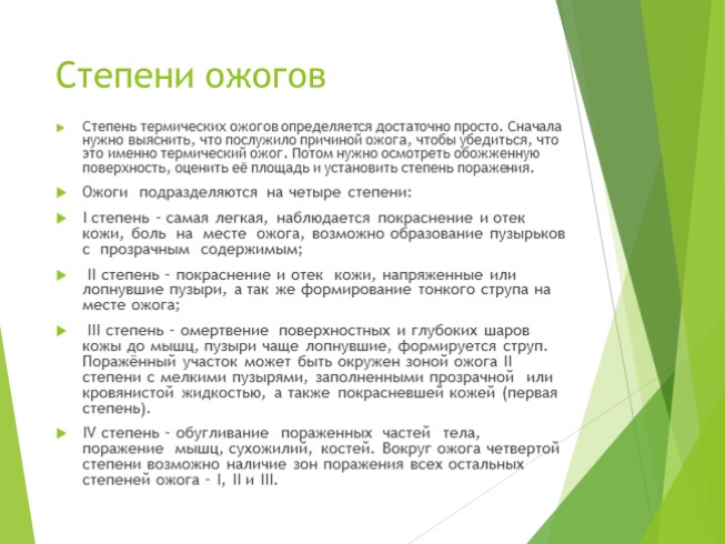 III степень – омертвение поверхностных и глубоких шаров кожы до мышц, пузыри чаще лопнувшие, формируется струп. Поражённый участок может быть окружен зоной ожога II степени с мелкими пузырями, заполненными прозрачной или кровянистой жидкостью, а также покрасневшей кожей (первая степень).