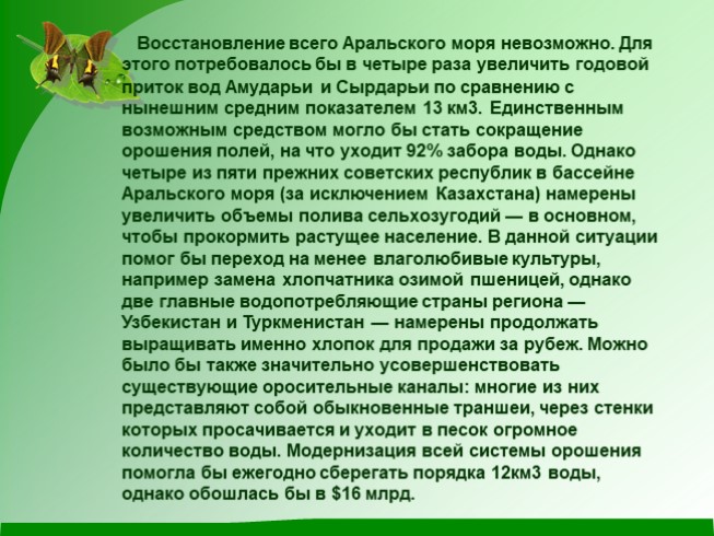 Восстановление всего Аральского моря невозможно. Для этого потребовалось бы в четыре раза увеличить годовой приток вод Амударьи и Сырдарьи по сравнению с нынешним средним показателем 13 км3. Единственным возможным средством могло бы стать сокращение орошения полей, на что уходит 92% забора воды. Однако четыре из пяти прежних советских республик в бассейне Аральского моря (за исключением Казахстана) намерены увеличить объемы полива сельхозугодий — в основном, чтобы прокормить растущее население. В данной ситуации помог бы переход на менее влаголюбивые культуры, например замена хлопчатника озимой пшеницей, однако две главные водопотребляющие страны региона — Узбекистан и Туркменистан — намерены продолжать выращивать именно хлопок для продажи за рубеж. Можно было бы также значительно усовершенствовать существующие оросительные каналы: многие из них представляют собой обыкновенные траншеи, через стенки которых просачивается и уходит в песок огромное количество воды. Модернизация всей системы орошения помогла бы ежегодно сберегать порядка 12км3 воды, однако обошлась бы в $16 млрд.
