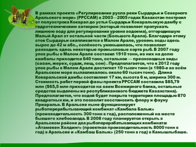 В рамках проекта «Регулирование русла реки Сырдарьи и Северного Аральского моря» (РРССАМ) в 2003—2005 годах Казахстан построил от полуострова Кокарал до устья Сырдарьи Кокаральскую дамбу с гидротехническим затвором (который позволяет пропускать лишнюю воду для регулирования уровня водоема), отгородившую Малый Арал от остальной части (Большого Арала). Благодаря этому сток Сырдарьи скапливается в Малом Арале, уровень воды здесь вырос до 42 м абс., солёность уменьшилась, что позволяет разводить здесь некоторые промысловые сорта рыб. В 2007 году улов рыбы в Малом Арале составил 1910 тонн, из них на долю камбалы приходится 640 тонн, остальное — пресноводные виды (сазан, жерех, судак, лещ, сом) . Предполагается, что к 2012 году улов рыбы в Малом Арале достигнет 10 тысяч тонн (в 1980-е во всём Аральском море вылавливалось около 60 тысяч тонн). Длина Кокаральской дамбы составляет 17 км, высота 6 м, ширина 300 м. Стоимость работ первой фазы проекта РРССАМ составила $85,79 млн ($65,5 млн приходится на заем Всемирного банка, остальные средства выделены из республиканского бюджета Казахстана). Предполагается, что водой будет покрыта территория площадью 870 квадратных км, и это позволит восстановить флору и фауну Приаралья. В Аральске ныне функционирует рыбоперерабытывающий комбинат «Камбала Балык» (производительность 300 тонн в год), расположенный на месте бывшего хлебозавода. В 2008 году планируется открыть в Аральском районе два рыбоперерабатывающих комбината: «Атамекен Холдинг» (проектная производительность 8000 тонн в год) в Аральске и «Камбаш Балык» (250 тонн в год) в Камышлыбаше.
