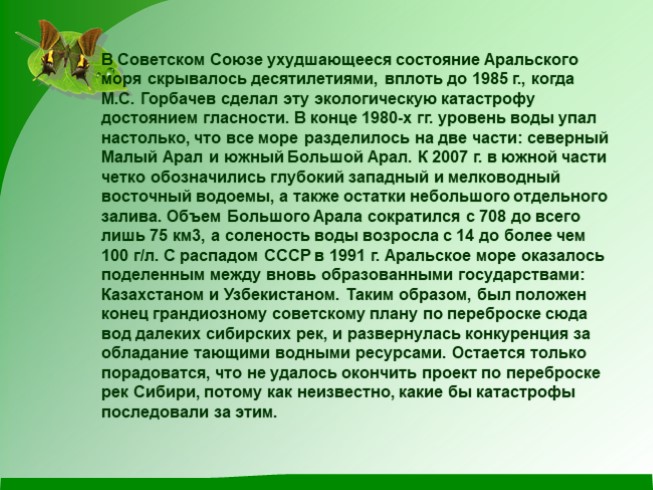 В Советском Союзе ухудшающееся состояние Аральского моря скрывалось десятилетиями, вплоть до 1985 г., когда М.С. Горбачев сделал эту экологическую катастрофу достоянием гласности. В конце 1980-х гг. уровень воды упал настолько, что все море разделилось на две части: северный Малый Арал и южный Большой Арал. К 2007 г. в южной части четко обозначились глубокий западный и мелководный восточный водоемы, а также остатки небольшого отдельного залива. Объем Большого Арала сократился с 708 до всего лишь 75 км3, а соленость воды возросла с 14 до более чем 100 г/л. С распадом СССР в 1991 г. Аральское море оказалось поделенным между вновь образованными государствами: Казахстаном и Узбекистаном. Таким образом, был положен конец грандиозному советскому плану по переброске сюда вод далеких сибирских рек, и развернулась конкуренция за обладание тающими водными ресурсами. Остается только порадоватся, что не удалось окончить проект по переброске рек Сибири, потому как неизвестно, какие бы катастрофы последовали за этим.