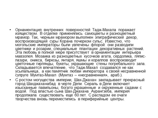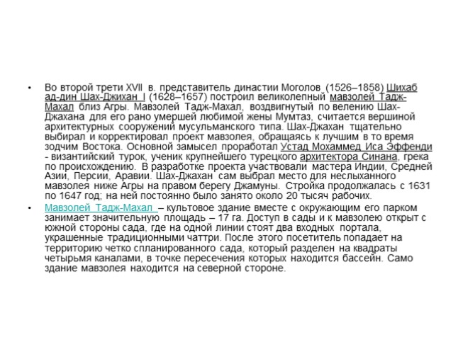 Во второй трети XVII в. представитель династии Моголов (1526–1858) Шихаб ад-дин Шах-Джихан I (1628–1657) построил великолепный мавзолей Тадж-Махал близ Агры. Мавзолей Тадж-Махал, воздвигнутый по велению Шах-Джахана для его рано умершей любимой жены Мумтаз, считается вершиной архитектурных сооружений мусульманского типа. Шах-Джахан тщательно выбирал и корректировал проект мавзолея, обращаясь к лучшим в то время зодчим Востока. Основной замысел проработал Устад Мохаммед Иса Эффенди - византийский турок, ученик крупнейшего турецкого архитектора Синана, грека по происхождению. В разработке проекта участвовали мастера Индии, Средней Азии, Персии, Аравии. Шах-Джахан сам выбрал место для неслыханного мавзолея ниже Агры на правом берегу Джамуны. Стройка продолжалась с 1631 по 1647 год; на ней постоянно было занято около 20 тысяч рабочих.