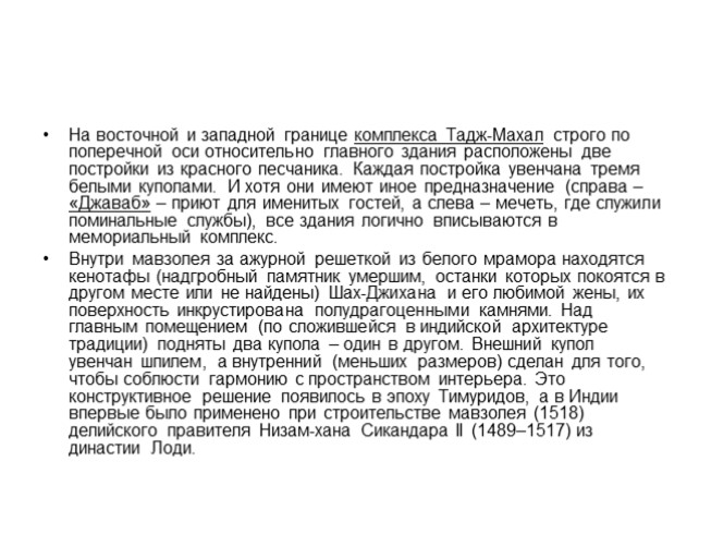 Мавзолей султана Насир ад-дина Хумайюна Среди выдающихся памятников мусульманской архитектуры Индии следует назвать мавзолей султана Насир ад-дина Хумайюна (1508–1556) из династии Моголов в Дели, построенный в 1557–1565. Его архитектор Мирак-мирза Гийас использовал персидскую композицию чахар-баг («четыре сада»). Восьмигранный план усыпальницы находится в центре сада. Его территория пересекается каналами, которые отождествляются с четырьмя реками рая. Сад огорожен от города стенами с четырьмя порталами. Каждый портал состоит из айвана, под углом к которому расположены два небольших здания той же высоты, с двумя этажами худжр (в плане это здание напоминает «открытую» подкову). Края верхней линии портала фланкированы небольшими чисто индийскими башенками, напоминающими паланкин на спине слона – чаттри. Здание построено из красного песчаника, который прекрасно гармонирует с белым мрамором. Мрамор чаще всего использовался, чтобы подчеркнуть вертикали и контуры арок. Традиционного исламского декора в этом здании нет, однако на внешних фасадах здания цветным камнем обозначены шестиконечные звезды. Венчает мавзолей двойной купол (внутренний и внешний), с небольшим шпилем. Обращает на себя внимание также форма минаретов, которые служат продолжением граней здания. Их количество – почти всегда чётное – приводит к заключению о том, что в Индии минарет скорее всего выполнял декоративную функцию.