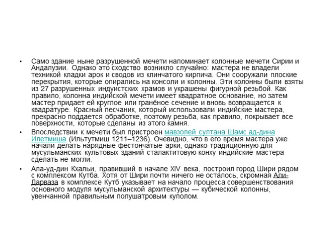 В 1192 в правление Гийас ад-дина Мухаммада (1163–1203) в Дели начали строить мечеть, получившую название «Кувват аль-Ислам» («мощь ислама» – араб.). Мечеть имеет гигантские размеры: 250 на 150 м, а общая площадь (вместе с вспомогательными постройками) – 4 гектара. Кутб ад-дин Айбак (1206–1219) построил из красного песчаника необычный минарет Кутуб-минар. Кажется, что минарет составлен из многочисленных конический секций, которые, как кольцами, скреплены ажурными балконами, опирающимися на сталактиты. Высота минарета 72,5 м, диаметр базы – 15 м, а диаметр вершины – 3 м. Тело башни покрыто кораническими надписями в арабо-персидской графике. После смерти Кутб ад-дина был закончен только первый ярус, его зять Шамс ад-дин Илетмиш (1211–1236) добавил еще четыре следующих, а правитель Фируз-шах III (1351–1388) после землетрясения 1368 был вынужден восстановить два верхних яруса, поэтому они были сделаны из мрамора.