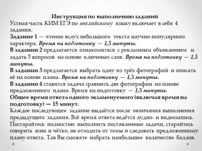 Постарайтесь полностью выполнить поставленные задачи, старайтесь говорить ясно и чётко, не отходить от темы и следовать предложенному плану ответа. Так Вы сможете набрать наибольшее количество баллов.
