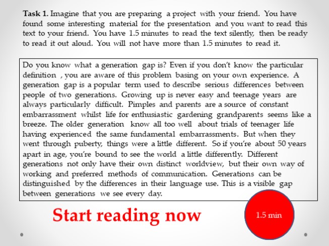 Задание 1 — чтение вслух небольшого текста научно-популярного характера. Время на подготовку — 1,5 минуты.