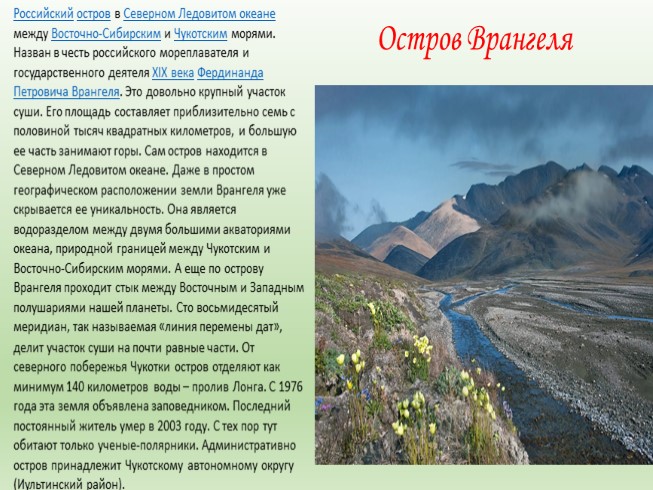 Российский остров в Северном Ледовитом океане между Восточно-Сибирским и Чукотским морями. Назван в честь российского мореплавателя и государственного деятеля XIX века Фердинанда Петровича Врангеля. Это довольно крупный участок суши. Его площадь составляет приблизительно семь с половиной тысяч квадратных километров, и большую ее часть занимают горы. Сам остров находится в Северном Ледовитом океане. Даже в простом географическом расположении земли Врангеля уже скрывается ее уникальность. Она является водоразделом между двумя большими акваториями океана, природной границей между Чукотским и Восточно-Сибирским морями. А еще по острову Врангеля проходит стык между Восточным и Западным полушариями нашей планеты. Сто восьмидесятый меридиан, так называемая «линия перемены дат», делит участок суши на почти равные части. От северного побережья Чукотки остров отделяют как минимум 140 километров воды – пролив Лонга. С 1976 года эта земля объявлена заповедником. Последний постоянный житель умер в 2003 году. С тех пор тут обитают только ученые-полярники. Административно остров принадлежит Чукотскому автономному округу (Иультинский район).