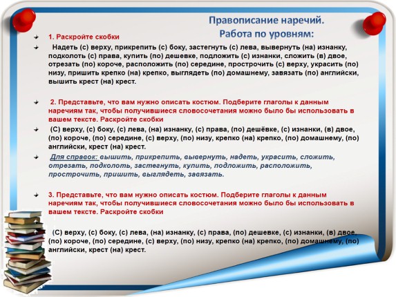 2. Представьте, что вам нужно описать костюм. Подберите глаголы к данным наречиям так, чтобы получившиеся словосочетания можно было бы использовать в вашем тексте. Раскройте скобки