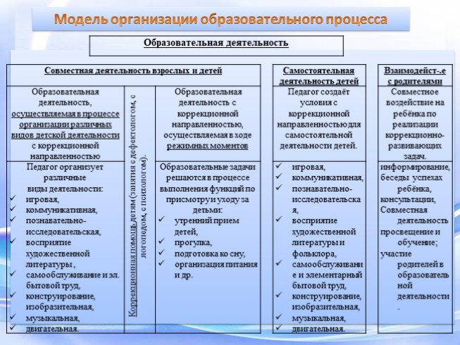Образовательная деятельность, осуществляемая в процессе организации различных видов детской деятельности с коррекционной направленностью Коррекционная помощь детям (занятия с дефектологом, с логопедом, с психологом). Образовательная деятельность с коррекционной направленностью, осуществляемая в ходе режимных моментов Педагог создаёт условия с коррекционной направленностью для самостоятельной деятельности детей. Совместное воздействие на ребёнка по реализации коррекционно-развивающих задач.