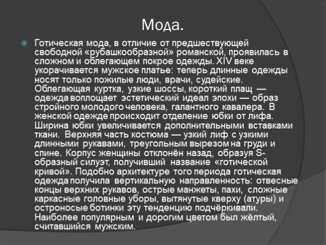 Готическая мода, в отличие от предшествующей свободной «рубашкообразной» романской, проявилась в сложном и облегающем покрое одежды. XIV веке укорачивается мужское платье: теперь длинные одежды носят только пожилые люди, врачи, судейские. Облегающая куртка, узкие шоссы, короткий плащ — одежда воплощает эстетический идеал эпохи — образ стройного молодого человека, галантного кавалера. В женской одежде происходит отделение юбки от лифа. Ширина юбки увеличивается дополнительными вставками ткани. Верхняя часть костюма — узкий лиф с узкими длинными рукавами, треугольным вырезом на груди и спине. Корпус женщины отклонён назад, образуя S-образный силуэт, получивший название «готической кривой». Подобно архитектуре того периода готическая одежда получила вертикальную направленность: отвесные концы верхних рукавов, острые манжеты, пахи, сложные каркасные головные уборы, вытянутые кверху (атуры) и остроносые ботинки эту тенденцию подчёркивали. Наиболее популярным и дорогим цветом был жёлтый, считавшийся мужским.
