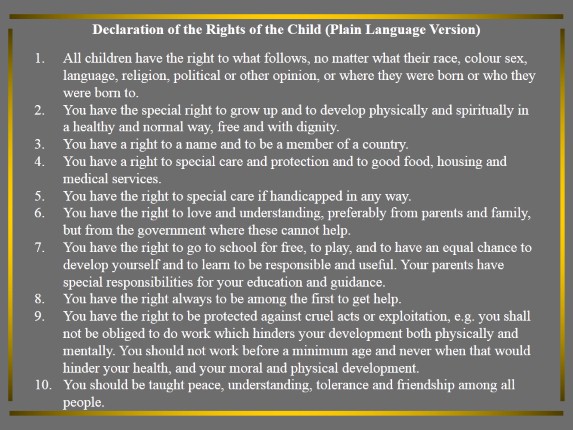 All children have the right to what follows, no matter what their race, colour sex, language, religion, political or other opinion, or where they were born or who they were born to.