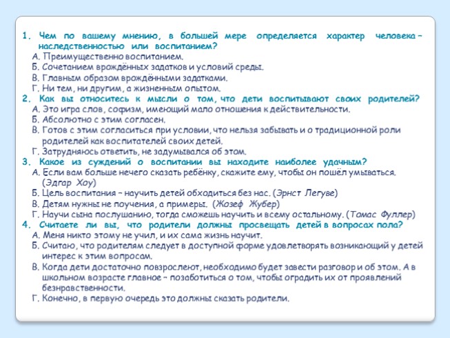 1. Чем по вашему мнению, в большей мере определяется характер человека – наследственностью или воспитанием?