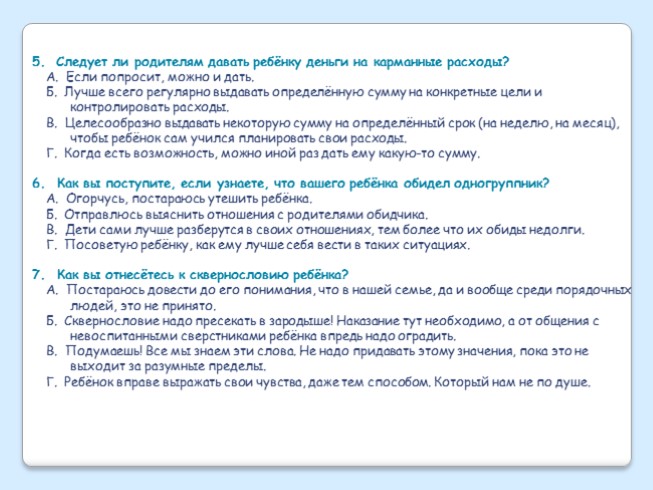 Если среди ваших ответов не преобладает какая-то категория, то речь, вероятно, идёт о противоречивом стиле воспитания, когда отсутствуют чёткие принципы, и поведение родителей диктуется сиюминутным настроением. Постарайтесь понять, каким же вы всё-таки хотите видеть своего ребёнка, а также самого себя как родителя.