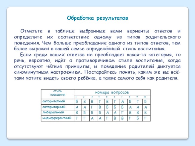 Отметьте в таблице выбранные вами варианты ответов и определите их соответствие одному из типов родительского поведения. Чем больше преобладание одного из типов ответов, тем более выражен в вашей семье определённый стиль воспитания.
