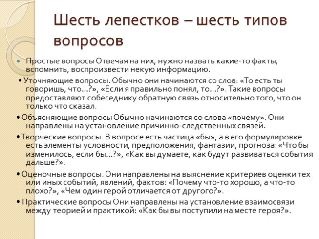 • Практические вопросы Они направлены на установление взаимосвязи между теорией и практикой: «Как бы вы поступили на месте героя?».