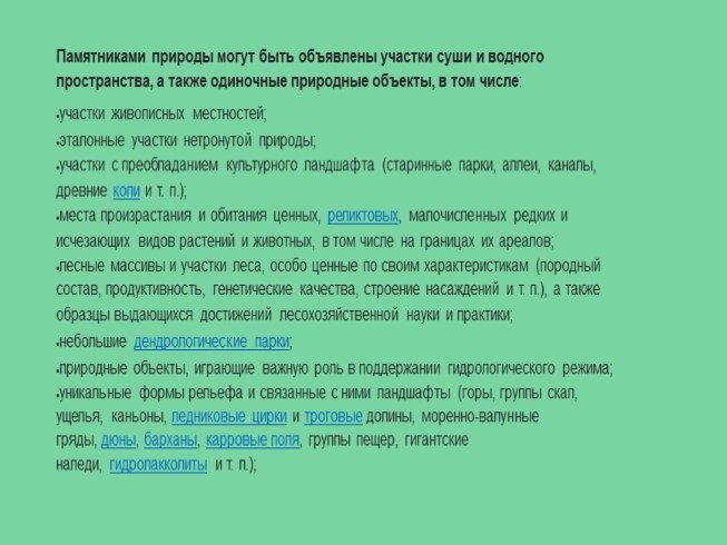 Памятниками природы могут быть объявлены участки суши и водного пространства, а также одиночные природные объекты, в том числе:
