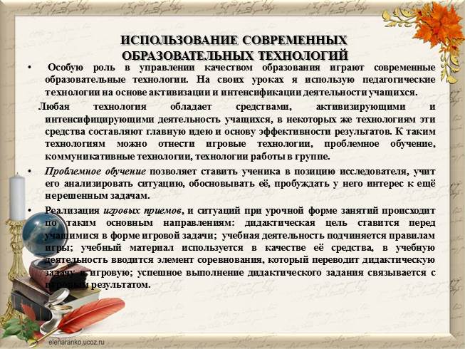 Особую роль в управлении качеством образования играют современные образовательные технологии. На своих уроках я использую педагогические технологии на основе активизации и интенсификации деятельности учащихся.