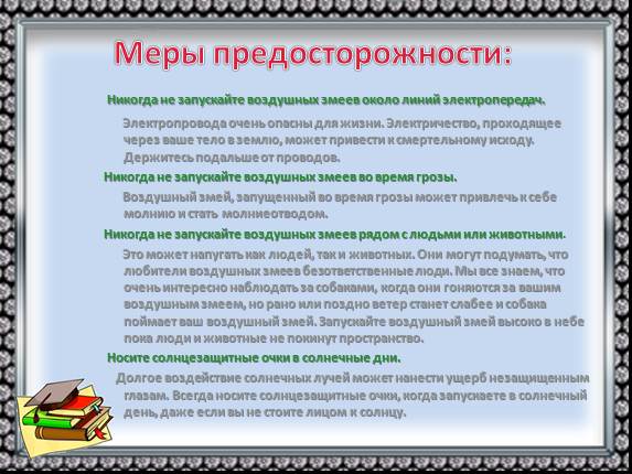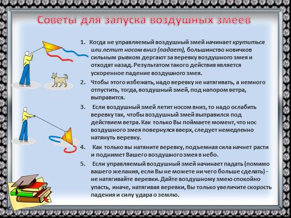 Это может напугать как людей, так и животных. Они могут подумать, что любители воздушных змеев безответственные люди. Мы все знаем, что очень интересно наблюдать за собаками, когда они гоняются за вашим воздушным змеем, но рано или поздно ветер станет слабее и собака поймает ваш воздушный змей. Запускайте воздушный змей высоко в небе пока люди и животные не покинут пространство.