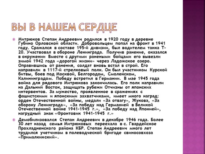 Митрюков Степан Андреевич родился в 1920 году в деревне Губино Орловской области. Добровольцем попал на фронт в 1941 году. Сражался в составе 195-й дивизии, был водителем танка Т-20. Участвовал в обороне Ленинграда. Получив ранение, оказался в окружении Вместе с другими ранеными бойцами его вывезли зимой 1942 года «дорогой жизни» через Ладожское озеро. Оправившись от ранения, солдат вновь встал в строй. Его направили в 1117-й стрелковый полк. Он был участником Курской битвы, боев под Москвой, Белгородом, Смоленском, Калининградом. Победу встретил в Германии. В мае 1945 года война для рядового Митрюкова закончилась. Его полк направили на Дальний Восток, защищать рубежи Отчизны от японских интервентов. За мужество, проявленное в сражениях с фашистскими и японскими захватчиками, имеет много наград: орден Отечественной войны, медали «За отвагу», Жукова, «За оборону Ленинграда», «За победу над Германией в Великой Отечественной войне 1941-1945 г.», «За победу над Японией», нагрудный знак «Фронтовик 1941-1945 г.»