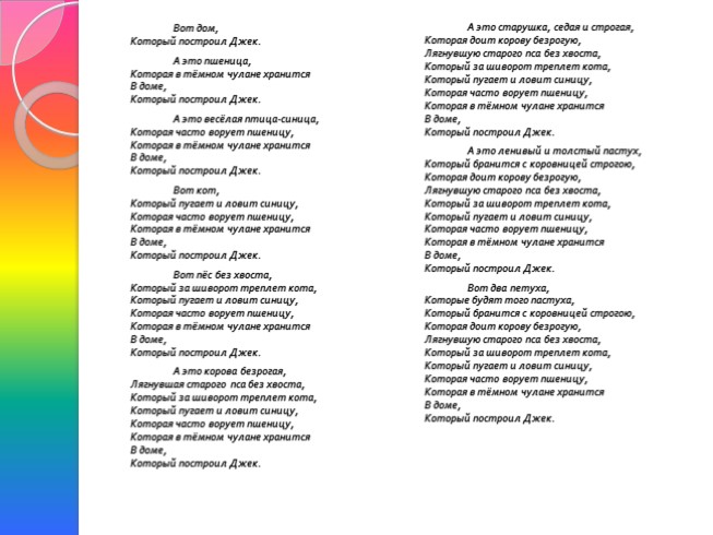 Вот два петуха, Которые будят того пастуха, Который бранится с коровницей строгою, Которая доит корову безрогую, Лягнувшую старого пса без хвоста, Который за шиворот треплет кота, Который пугает и ловит синицу, Которая часто ворует пшеницу, Которая в тёмном чулане хранится В доме, Который построил Джек.