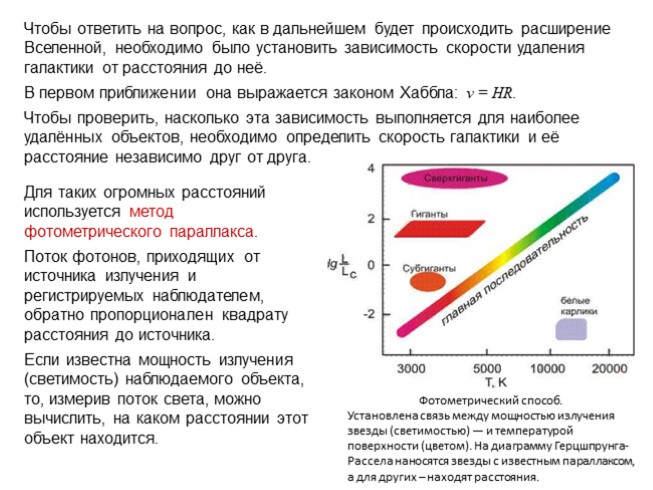 Чтобы ответить на вопрос, как в дальнейшем будет происходить расширение Вселенной, необходимо было установить зависимость скорости удаления галактики от расстояния до неё.