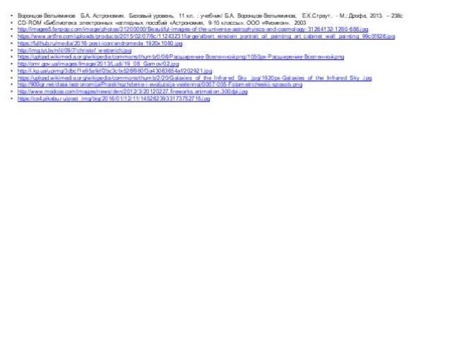 Воронцов-Вельяминов Б.А. Астрономия. Базовый уровень. 11 кл. : учебник/ Б.А. Воронцов-Вельяминов, Е.К.Страут. - М.: Дрофа, 2013. – 238с